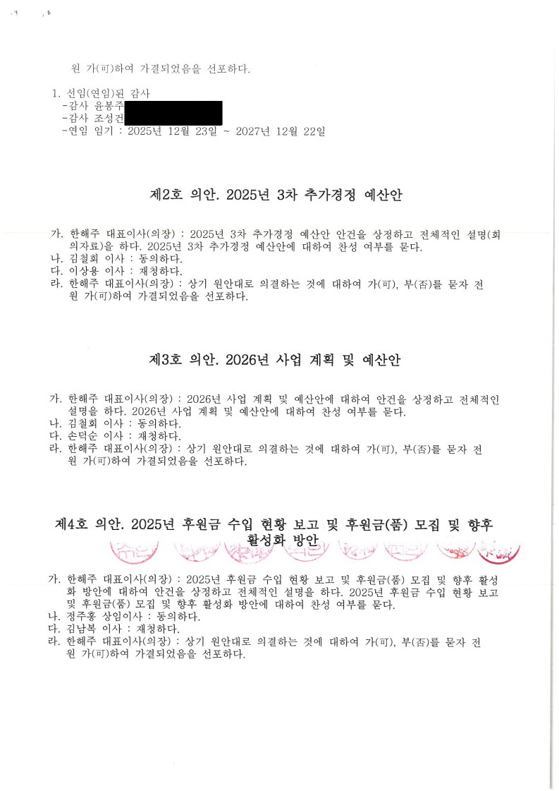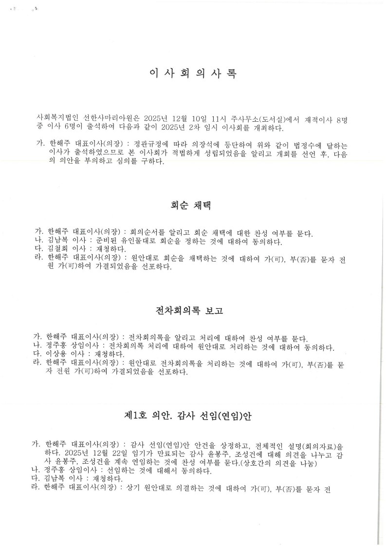 | 2025년 사회복지법인 선한사마리아원 2차 임시 이사회 회의록 공개