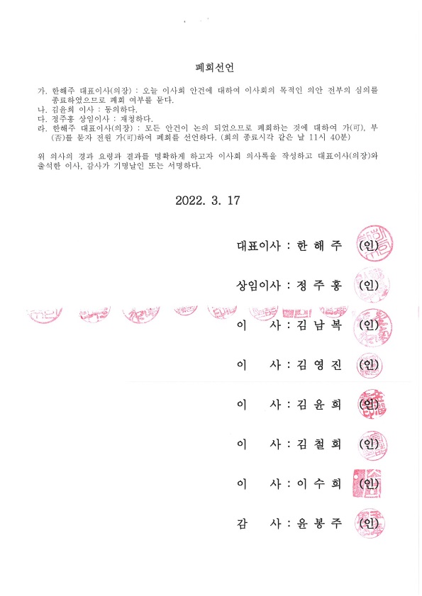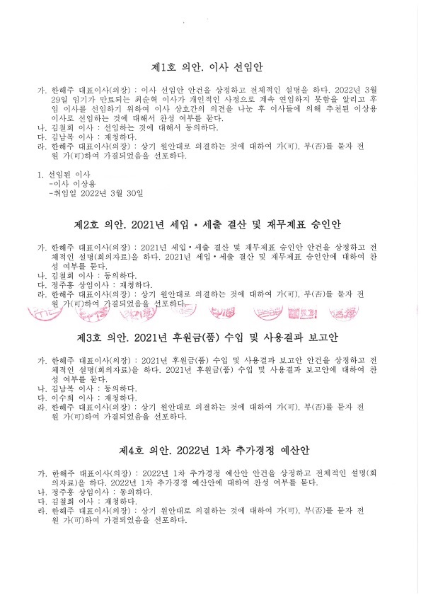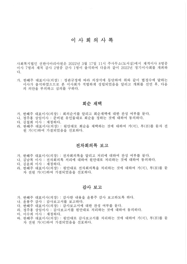| 2022년 사회복지법인 선한사마리아원 정기 이사회 회의록 공개(20220317)
