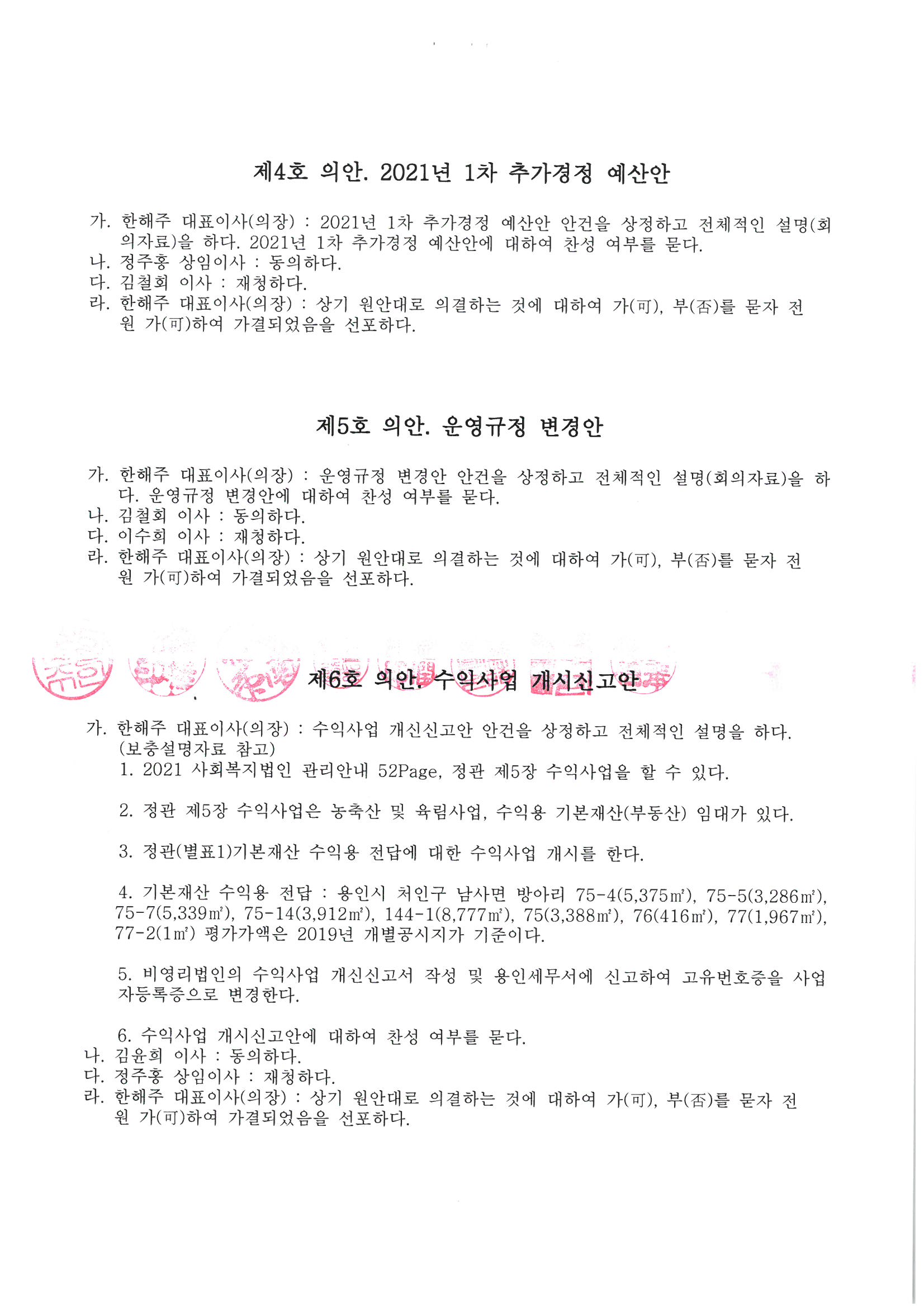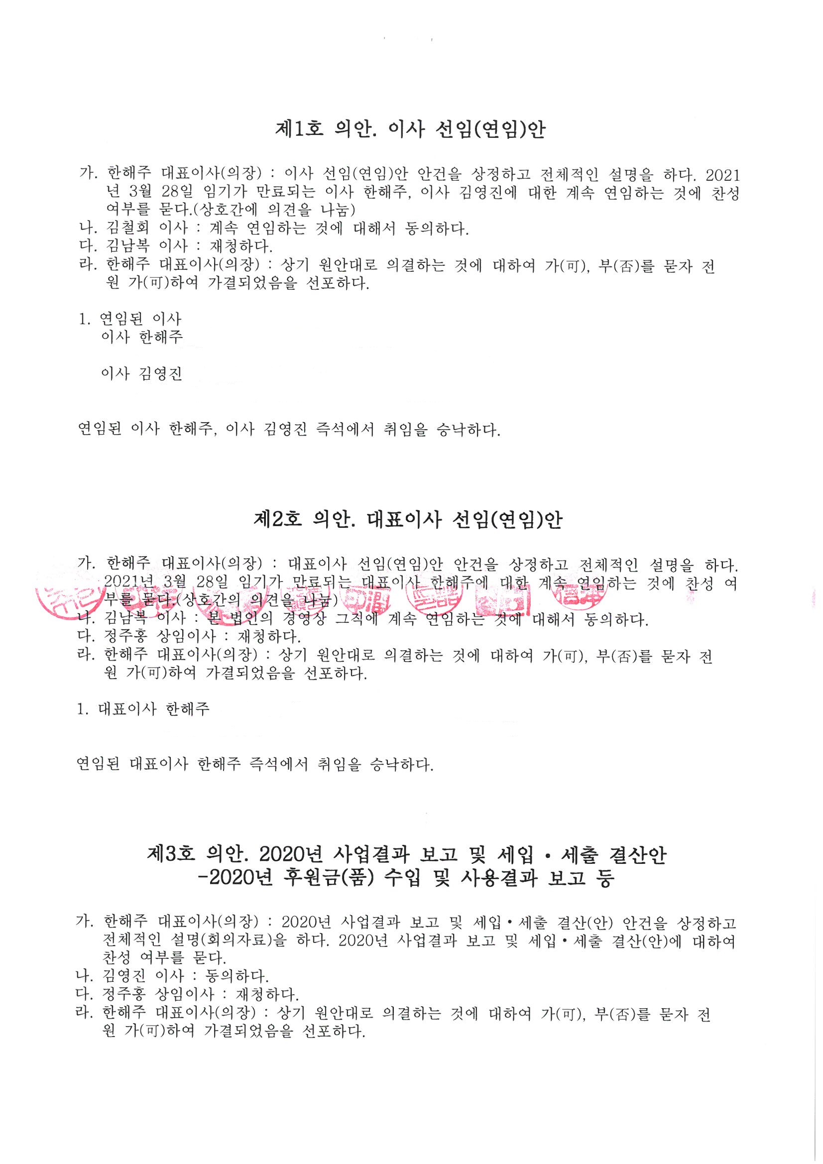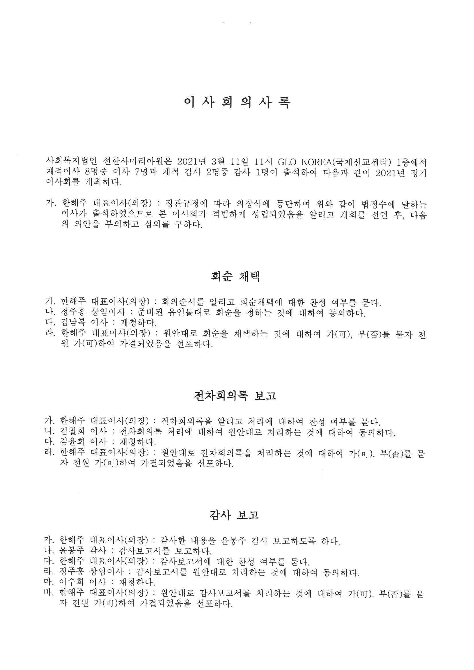 사회복지사업법 제25조(회의록의 작성 및 공개 등), 사회복지사업법 시행령 제10조의 4(회의록의 공개기간 등) 관련하여 2021년 사회복지법인 선한사마리아원 정기 이사회 회의록을 공개합니다.