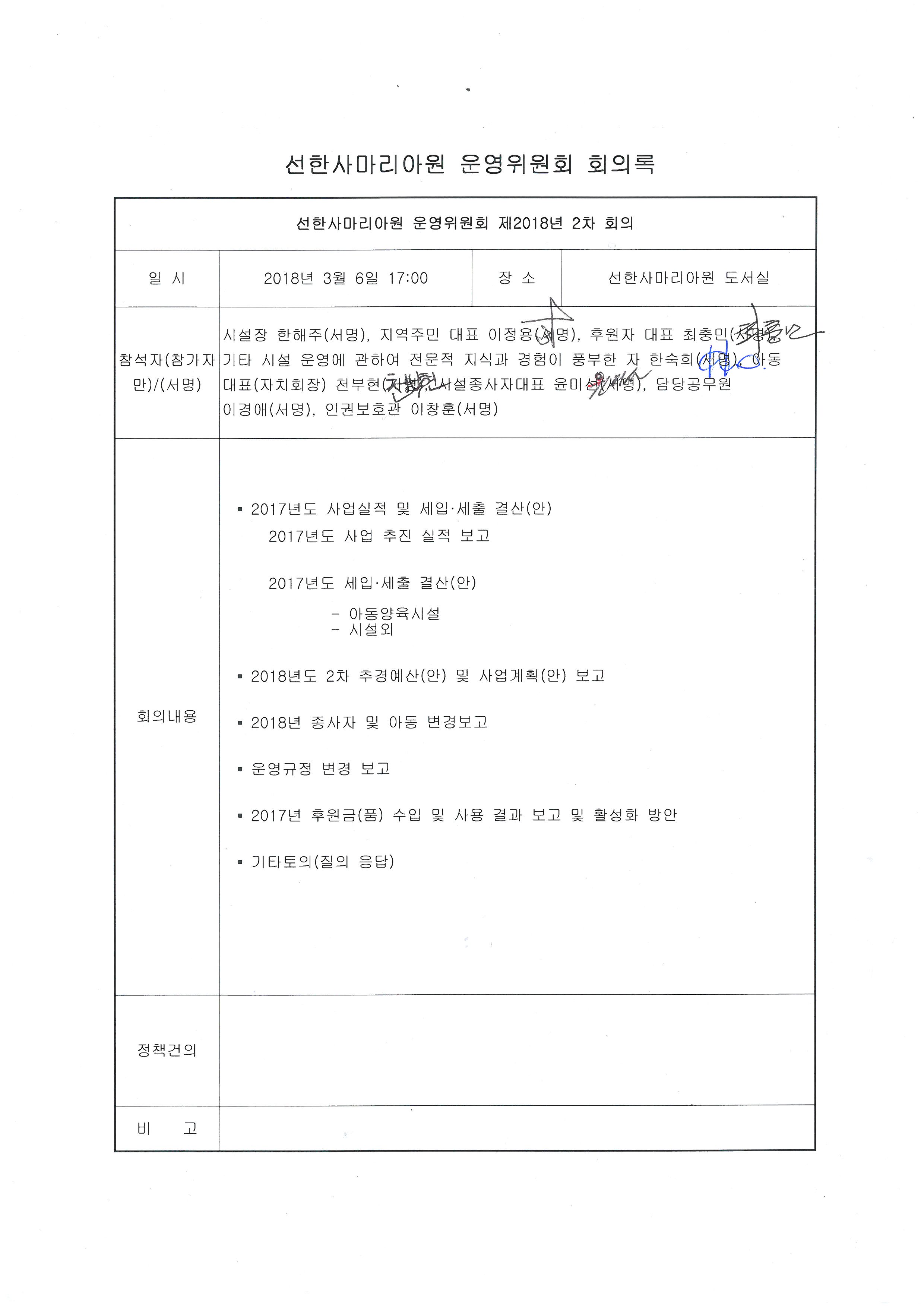 2018년 사회복지법인 선한사마리아원 정기 이사회 회의록 공개(20180312)