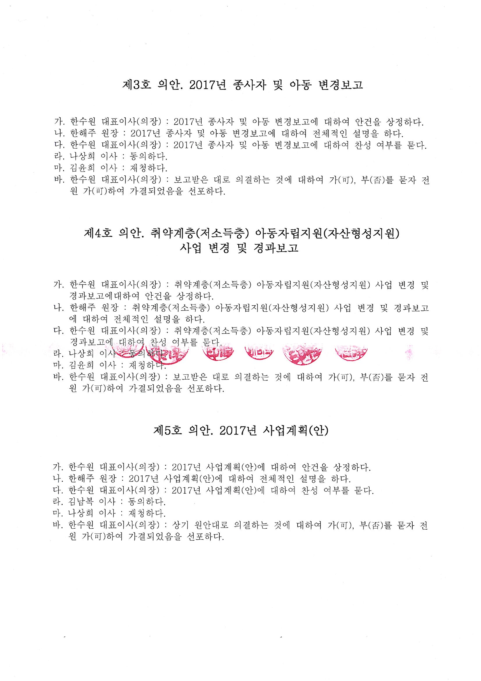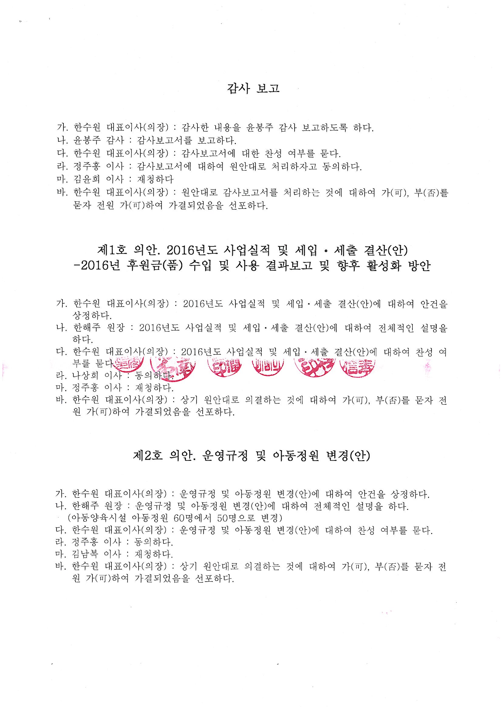 사회복지사업법 제25조(회의록의 작성 및 공개 등), 사회복지사업법 시행령 제10조의3(회의록의 공개기간 등) 관련하여 2017년 사회복지법인 선한사마리아원 정기 이사회 회의록을 공개합니다. |