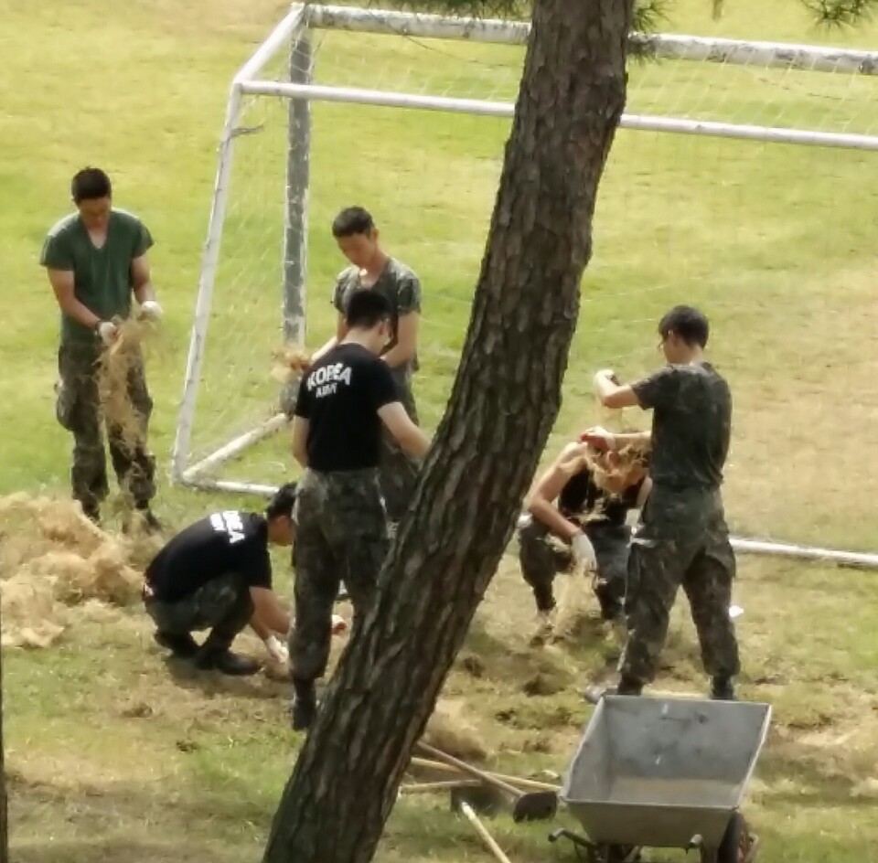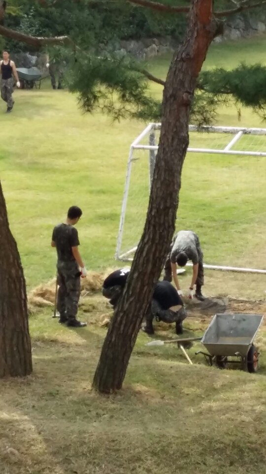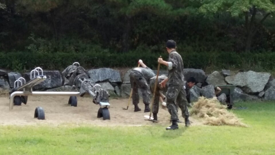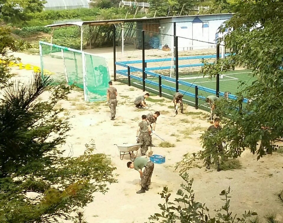 에버랜드 옆 육군항공대에서 9월 26일(토) 오전 방문하여 시설 주변 잔가지 및 풀을 깎아주고 운동장을 정비