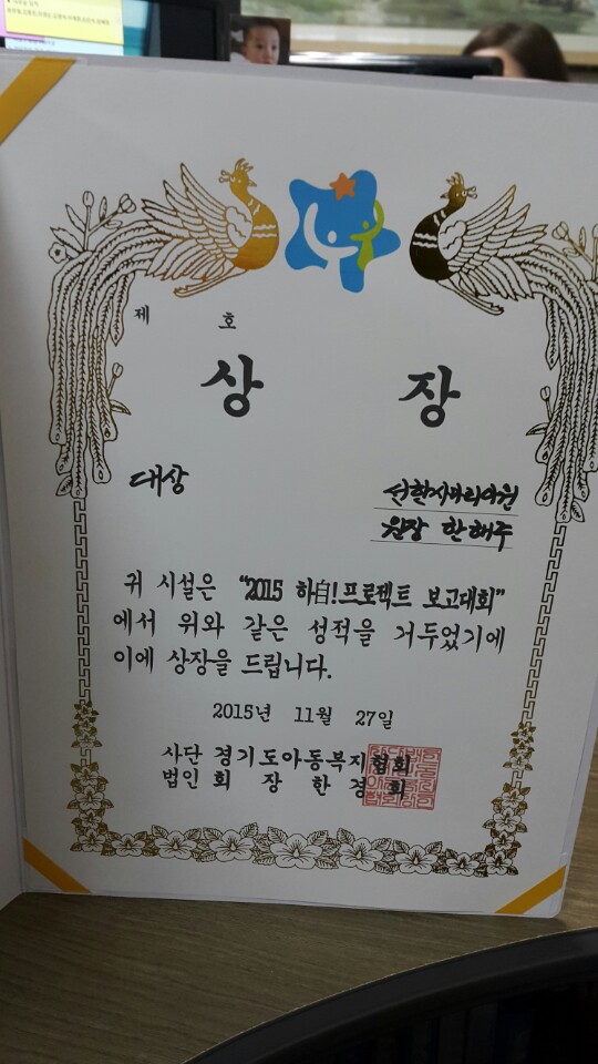 2015년 하自!프로젝트 보고대회 대상 수상 | 선한사마리아원 | 3,046 | 2015-12-02 |