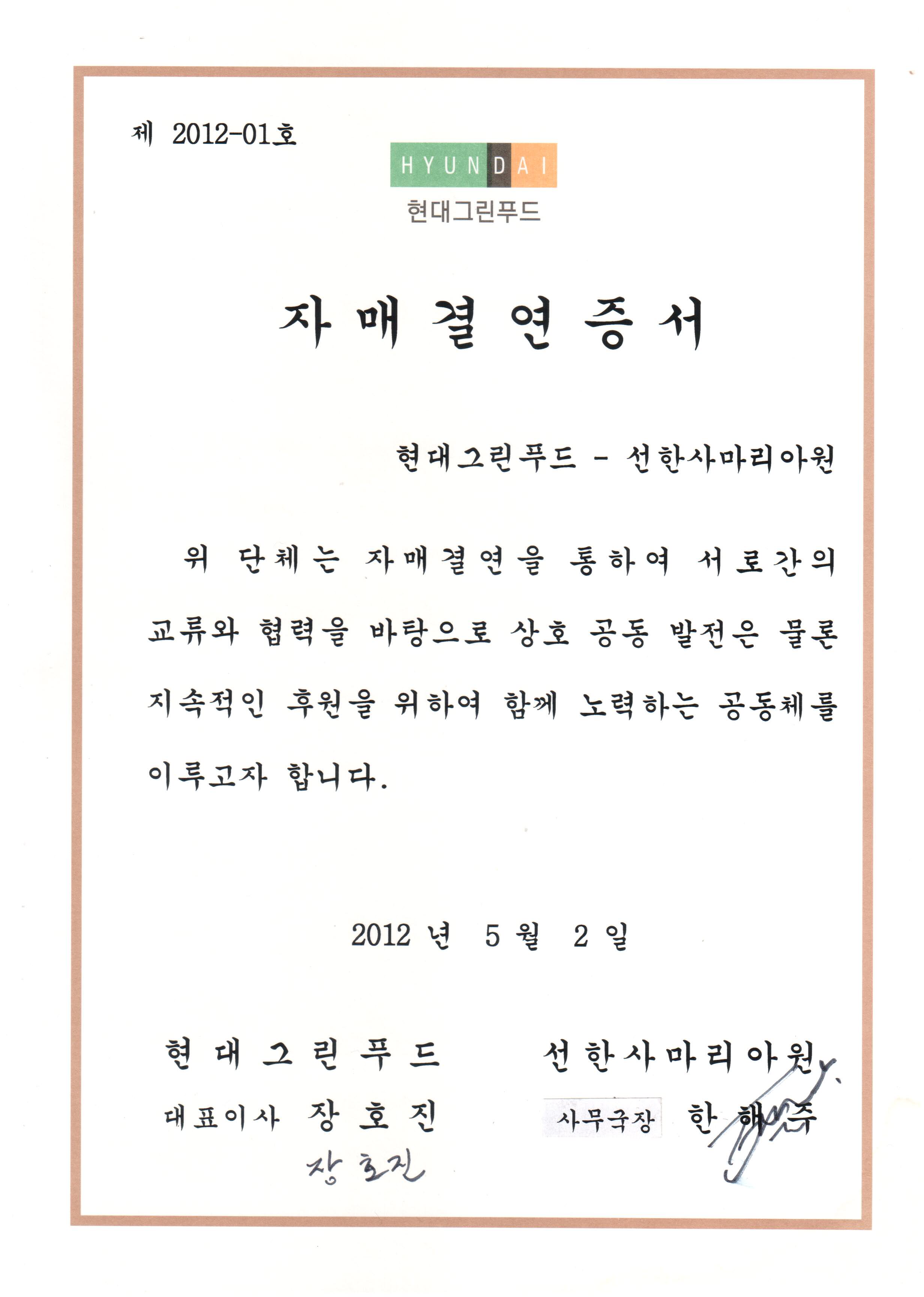 2012년 5월 2일 오후 3시 용인 현대그린푸드 본사에서 현대그린푸드&선한사마리아원이 자매결연을 맺었습니다.