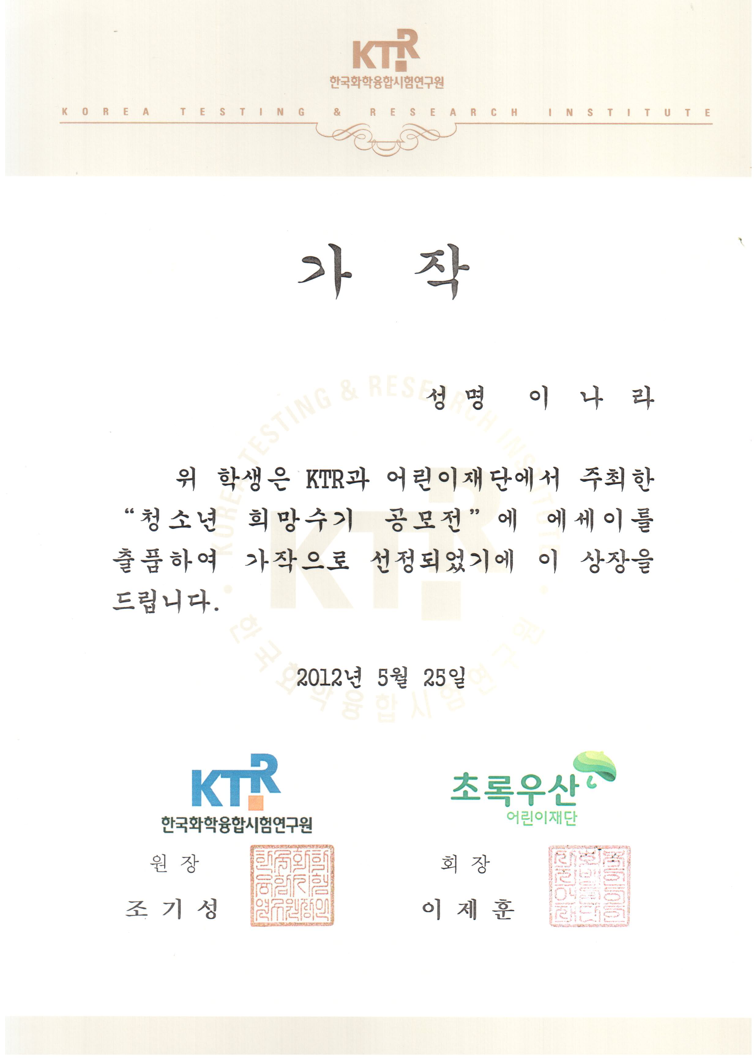 | 한국화학융합시험연구원&어린이재단 주최 청소년희망수기공모전 가작 ; 이나라