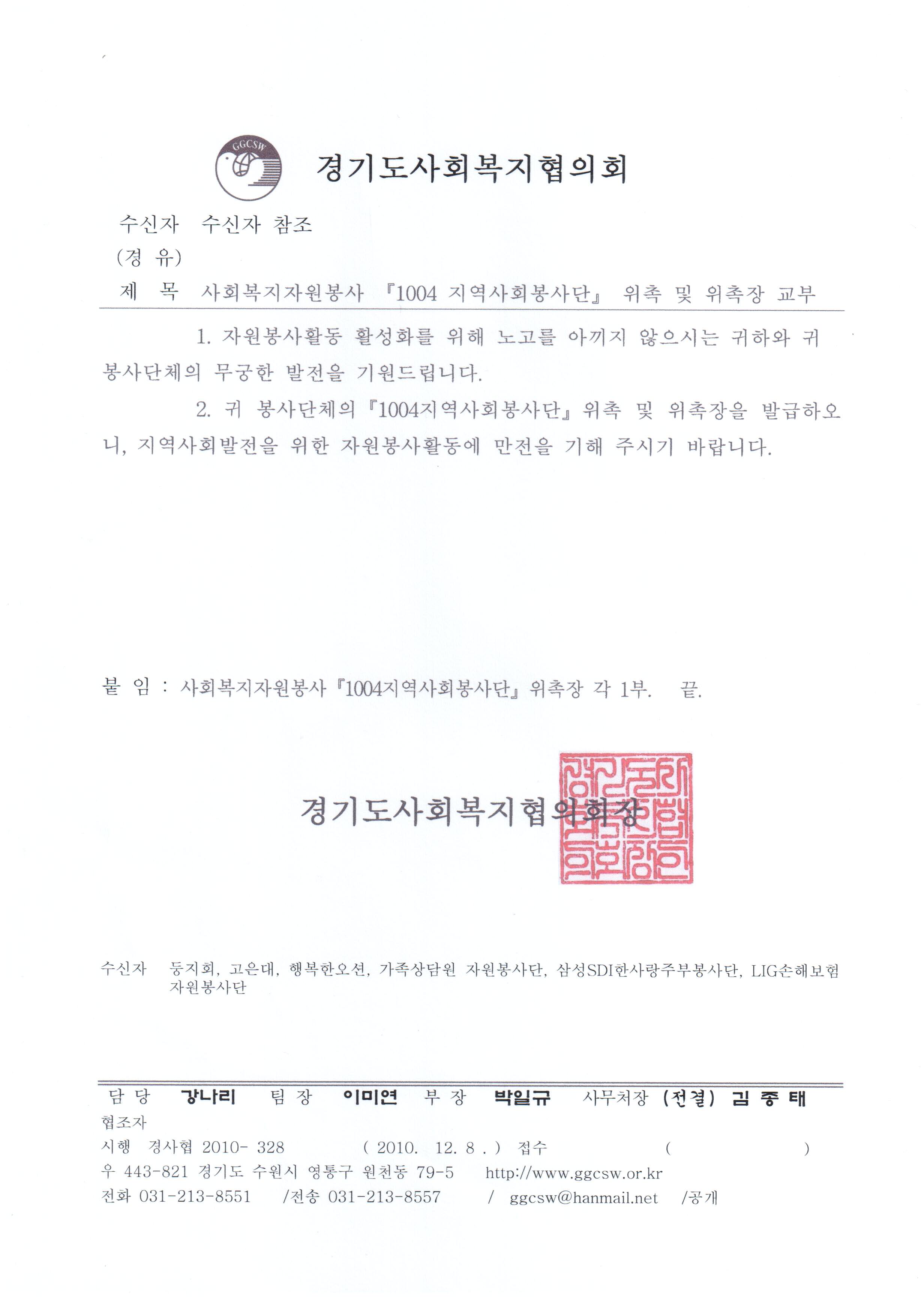 우리 아이들의 오랜 언니, 오빠, 형으로 우리 아이들을 위해 봉사하고 있는 고은대(경희대학교 봉사동아리)가 경기도 사회복지협회로 부터 '1004 지역사회 봉사단'으로 위촉이 되었네요~~ 축하합니다.!!