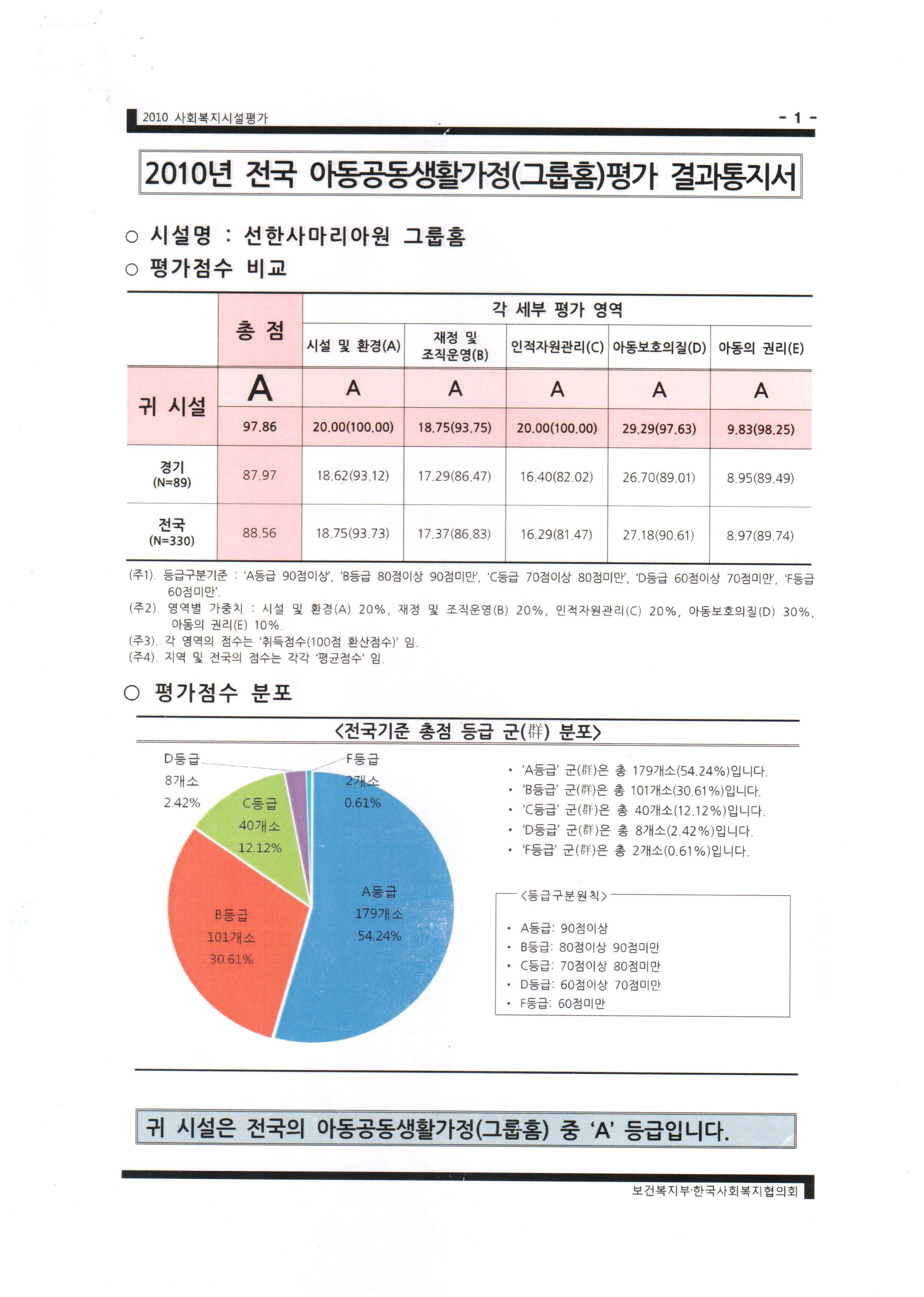 한국사회복지협의회 정책개발부411-92(2011. 2. 7) 2010년도 아동공동생활가정(그룹홈)평가에 따른 결과 통보에 따라 본 선한사마리아원의 결과를 안내합니다. 총점 "97.86"으로 전국 아동공동생활가정(그룹홈)중 'A' 등급을 획득했습니다.