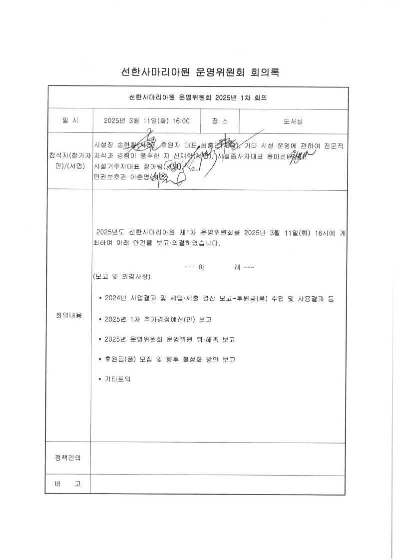 | 선한사마리아원 2025년 1차 운영위원회 결과 공고