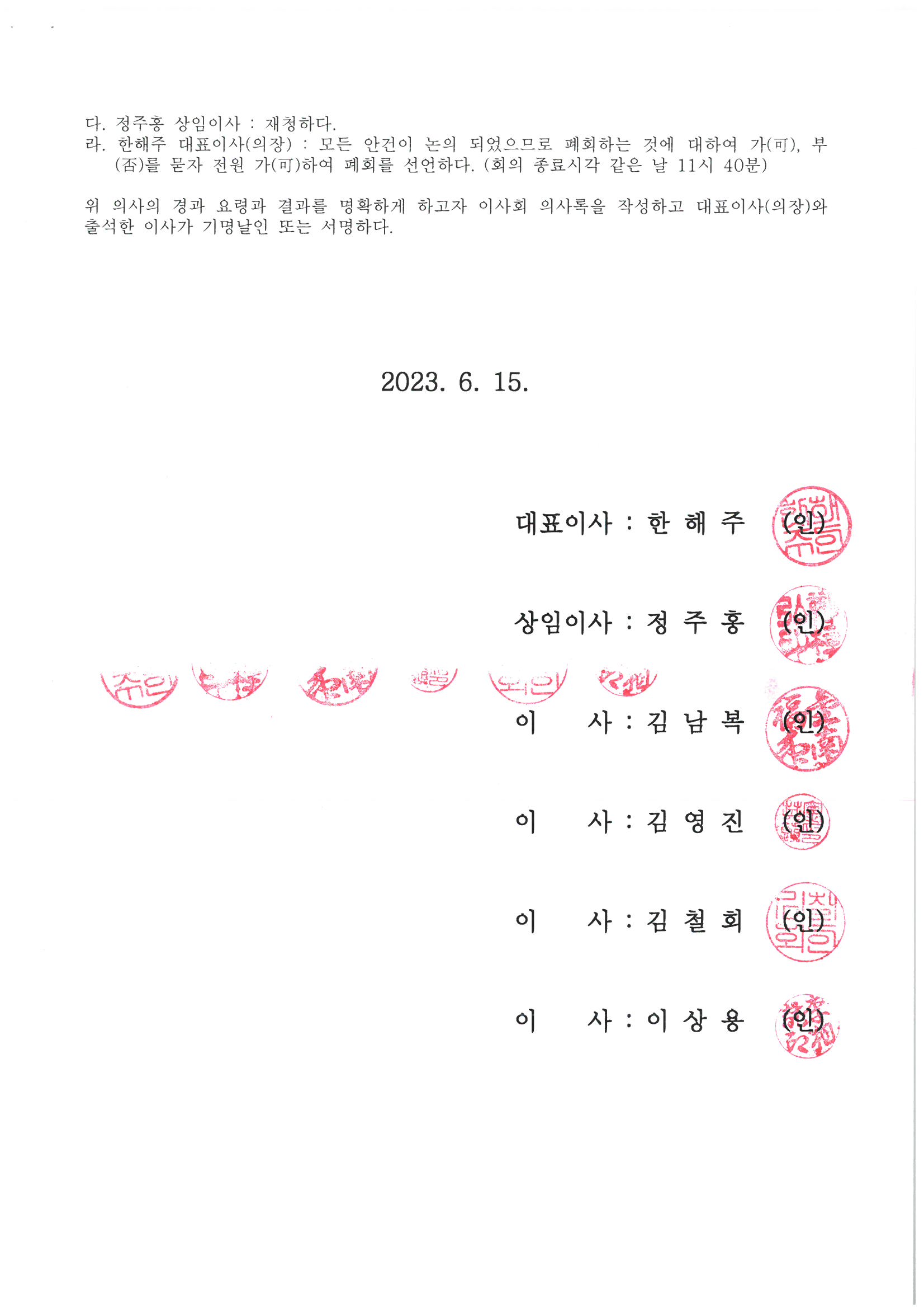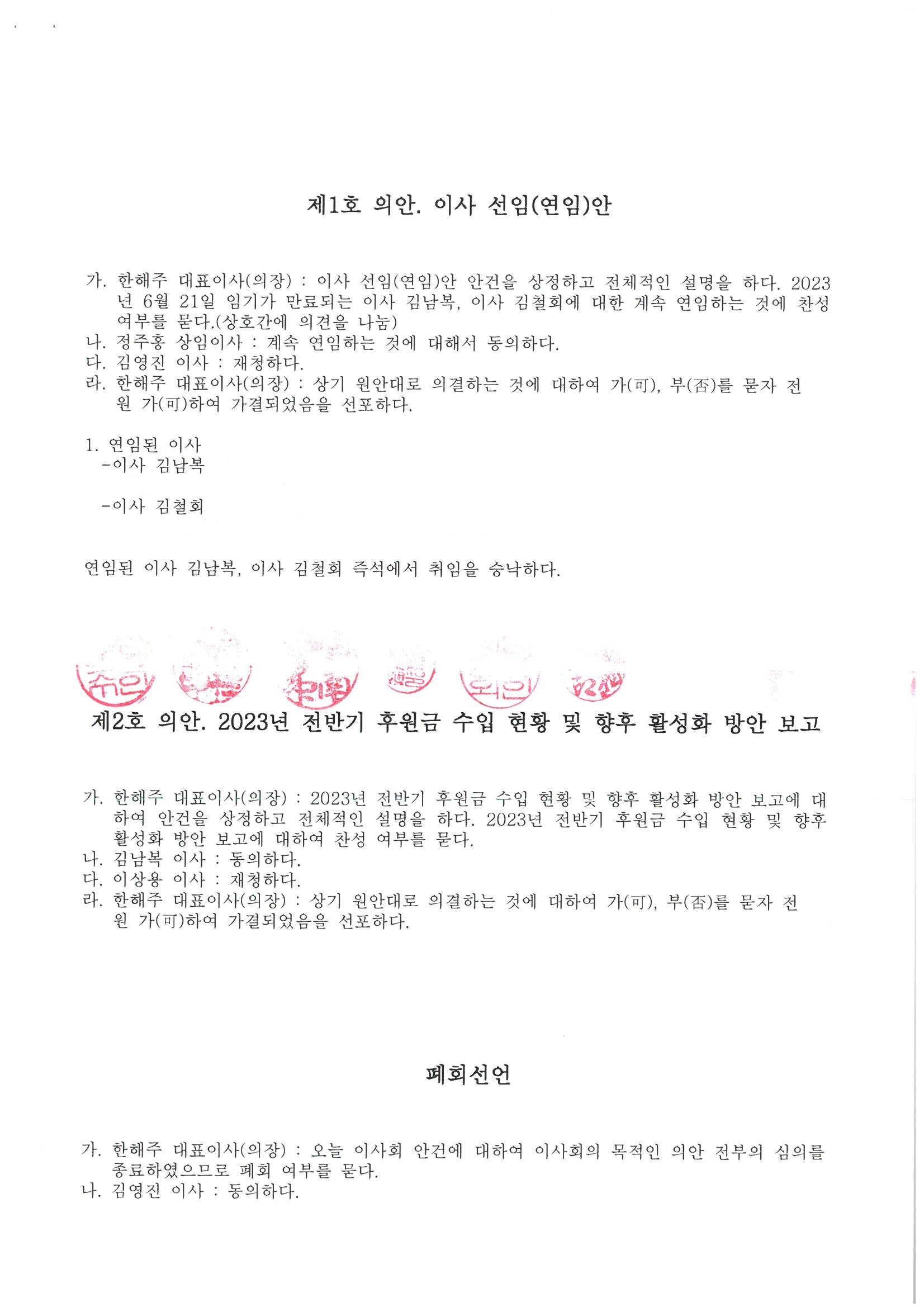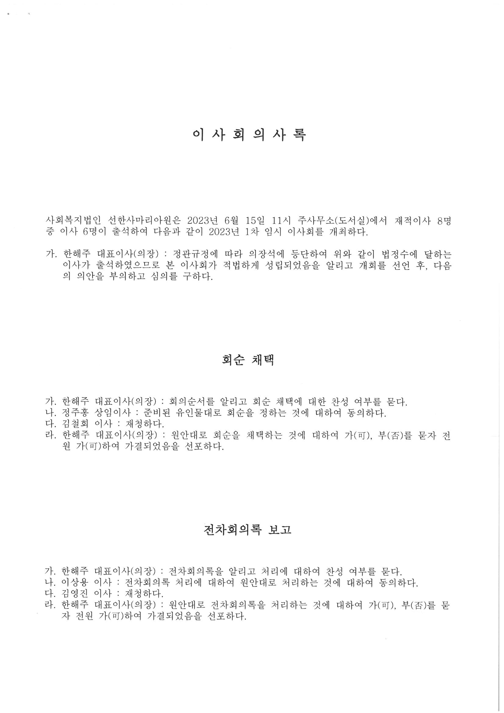 | 2023년 사회복지법인 선한사마리아원 1차 임시 이사회 회의록 공개(20230615)