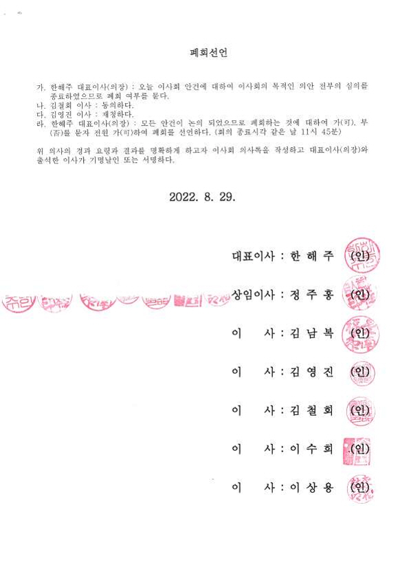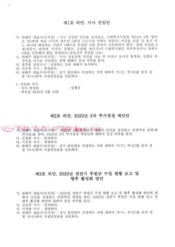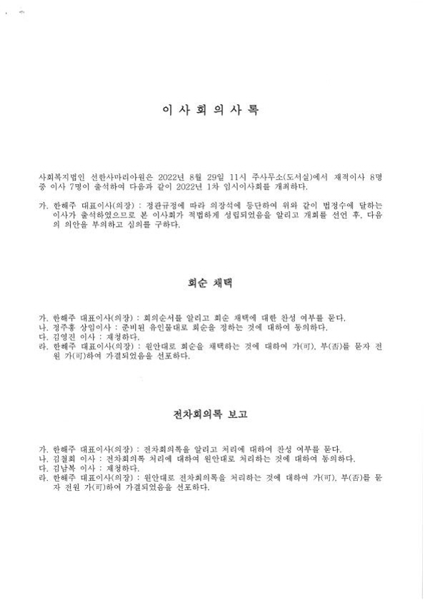 | 2022년 사회복지법인 선한사마리아원 1차 임시 이사회 회의록 공개(20220829)